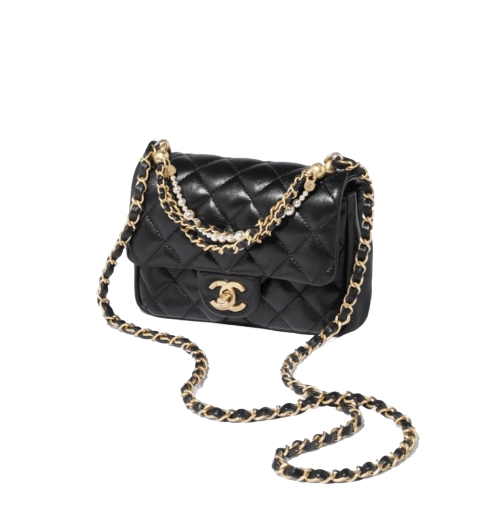 [프리미엄/해외배송]샤넬 쁘띠삭 진주 체인 미니 플랩 백(블랙/금장/램스킨)